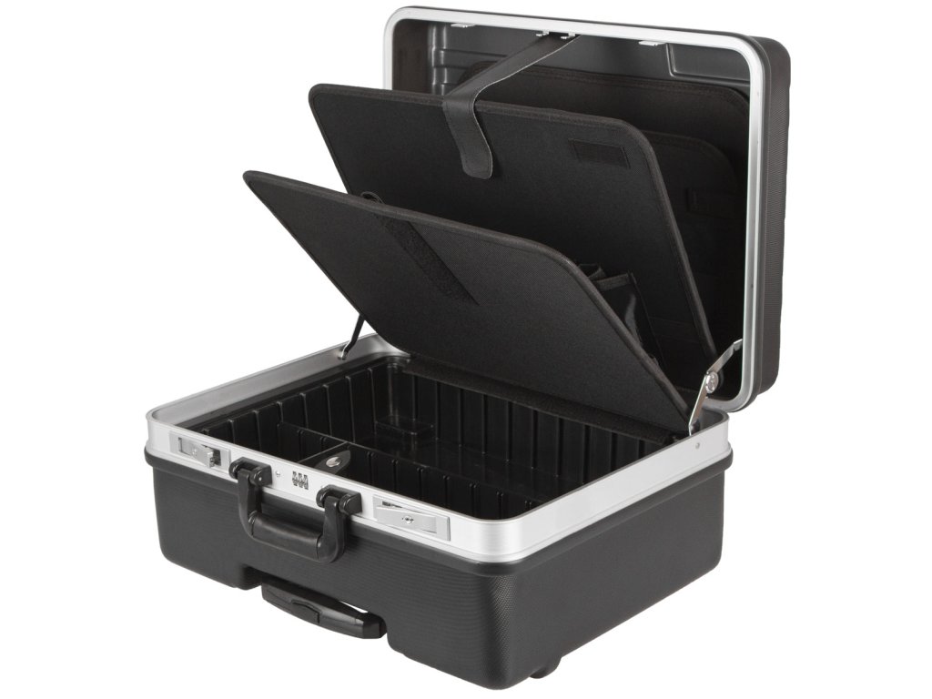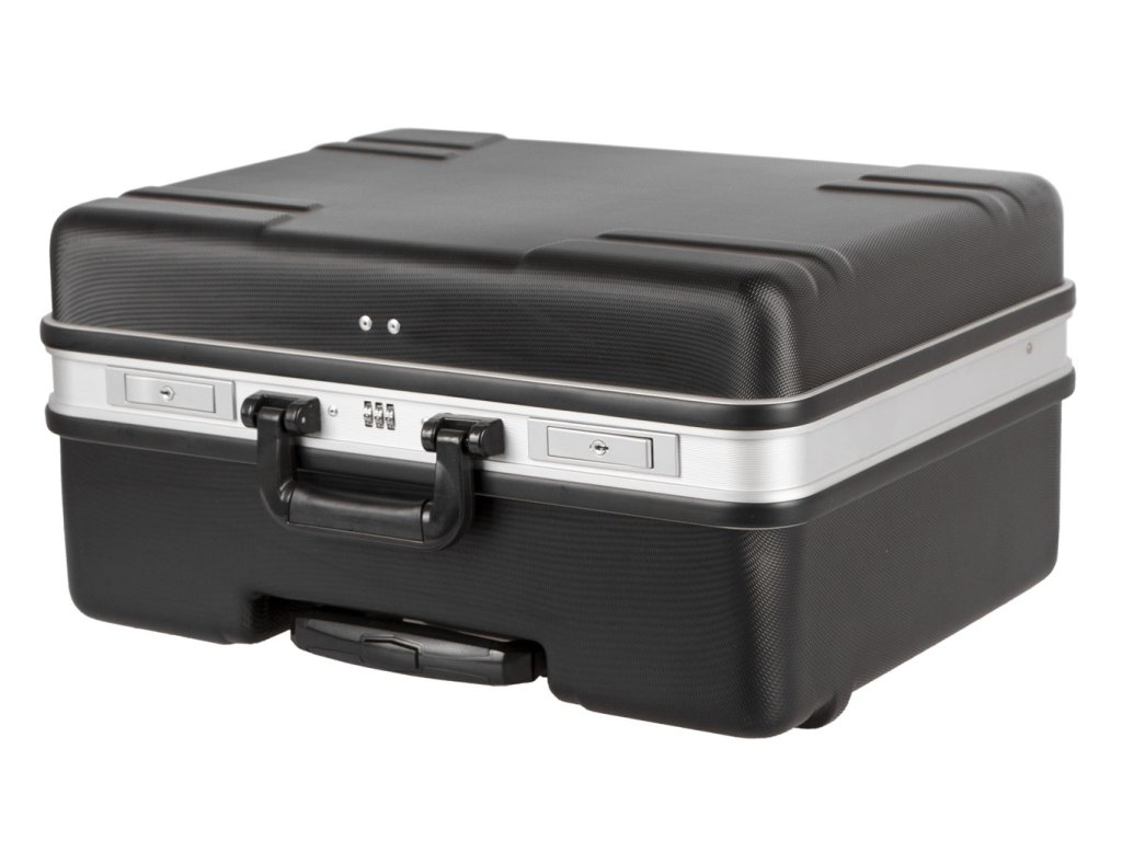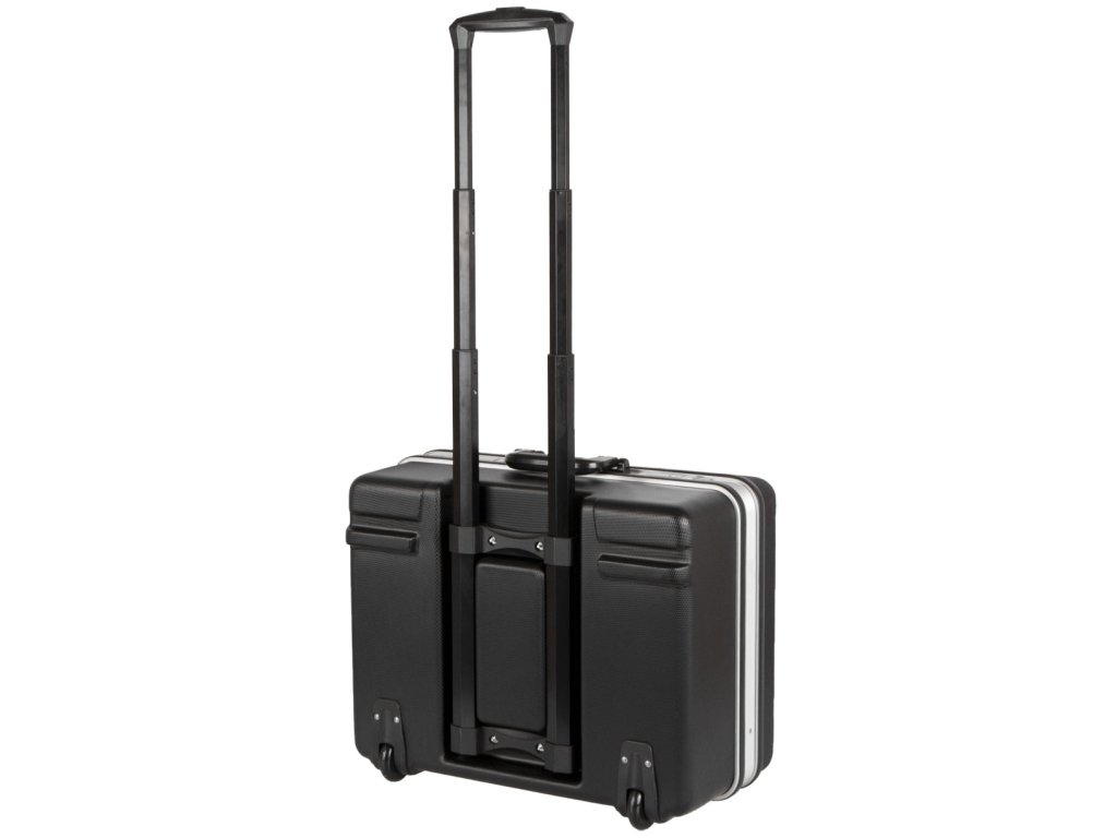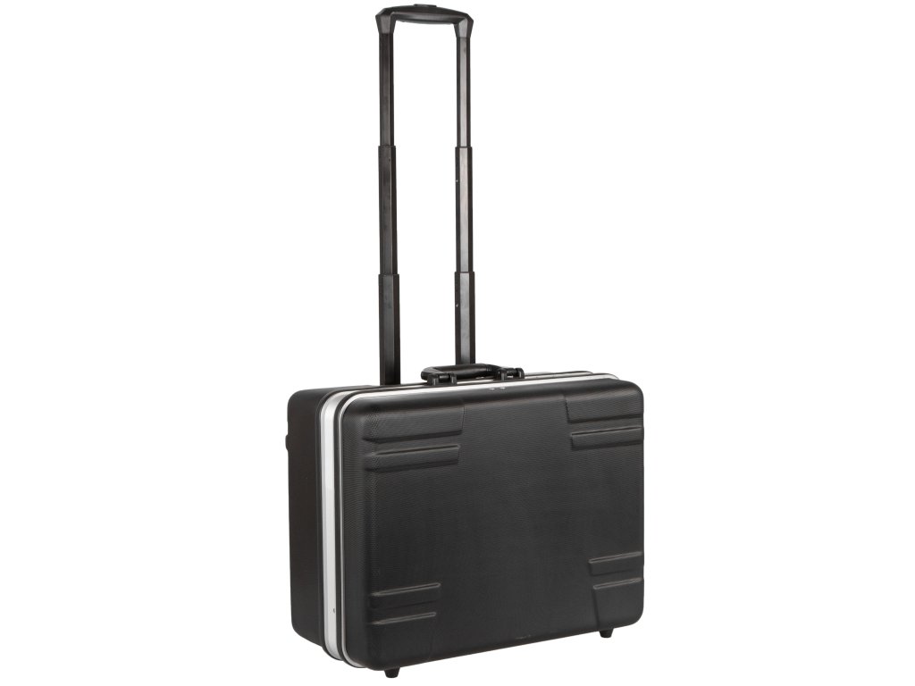 Kufr na nářadí o rozměrech (š x h x v): 500 x 400 x 255 mm. Kufr je lehce přenosný díky kolečkům a teleskopickému madlu.