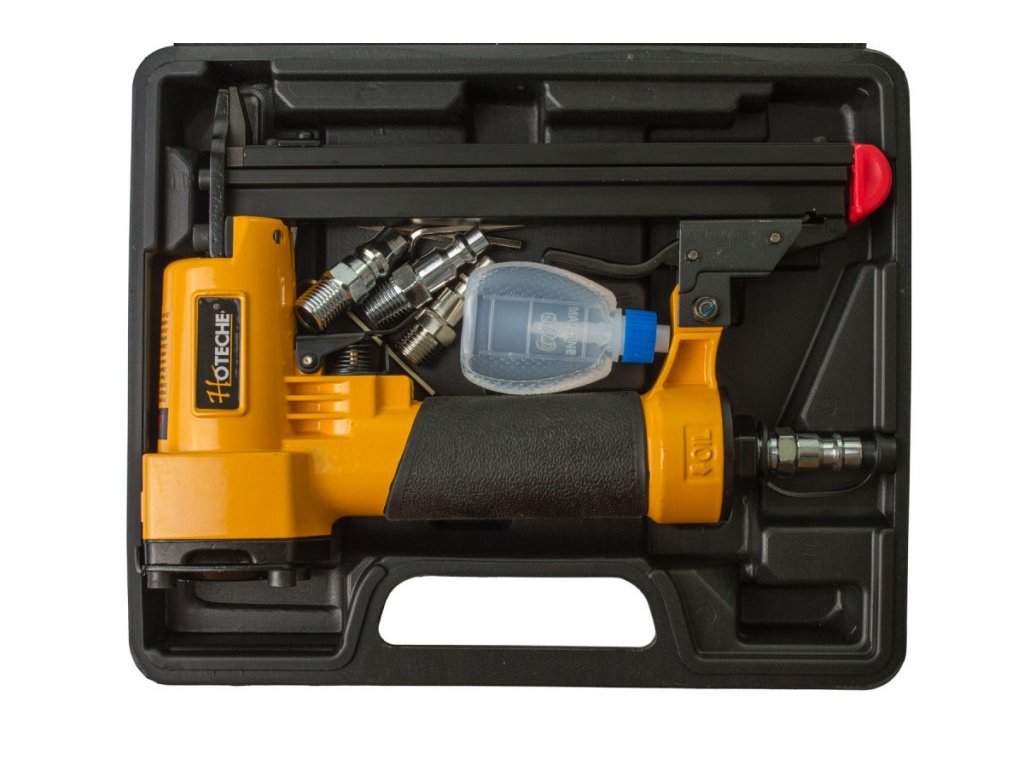 Jedná se o pneumatickou sponkovačku v černém praktickém kufříku od značky Hoteche.