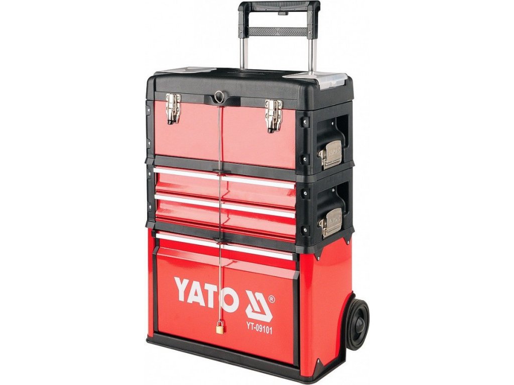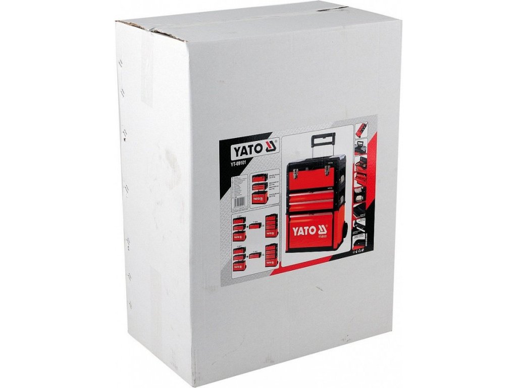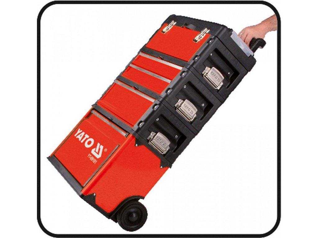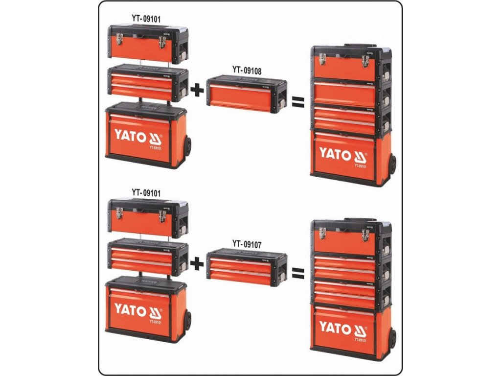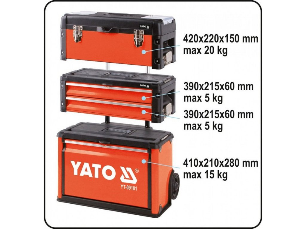 Modulární skříň/box na nářadí - 3-dílná. Souprava se skládá z hlavního modulu, kde najdeme vestavěná kola, teleskopickou hliníkovou rukojeť. Nosnost hlavního modulu je 15kg a rozměry 410x210x280mm. Střední modul má 2 kovové zásuvky s nosností 5kg a rozměry jednotlivé zásuvky je 390x215x60mm. Do těchto zásuvek lze vložit vložy s nářadím Yato. Zásuvky jsou na kovových kuličkových ložiskách. Horní modul je klasický s horním víkem o rozměrech 420x220x150mm a nosnosti 20kg. Má vestavěné 2 malé organizéry a uvnitř vložku na nářadí. Moduly rovnou horní plochu, která může sloužit jako pracovní deska. Navíc mají drážku, která je velmi užitečná při vrtání nebo šroubování. Kromě toho, že moduly jsou vybaveny komfortní a protiskluzovou rukojetí a boční rukojetí pro snadné zvedání mají také protiskluzové dolní hrany rohů. Skříň můžete rozšířit o další modul přidáním modulu YT-09107 nebo YT-09108. Moduly mají horní a střední kovové jištění mezi sebou.
