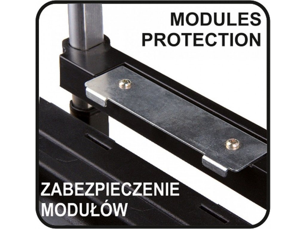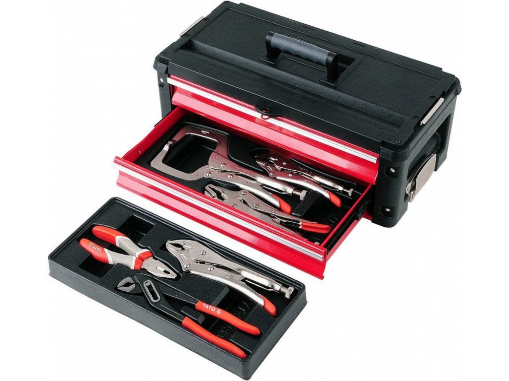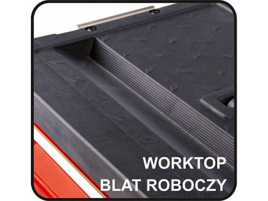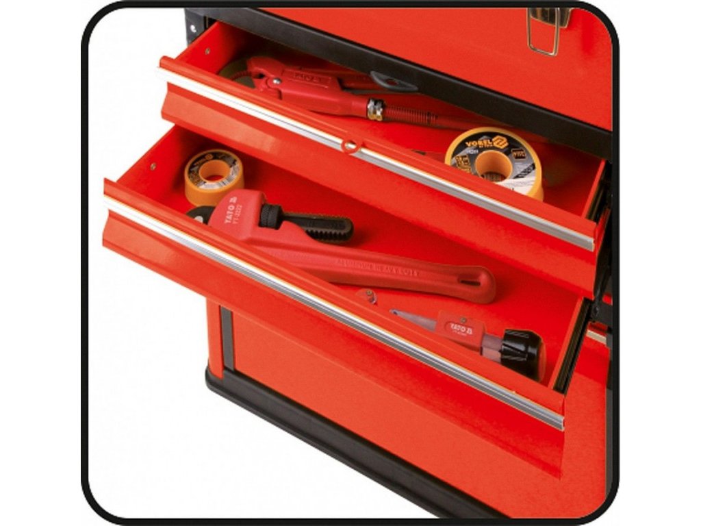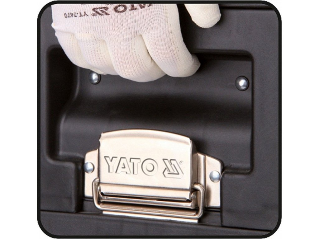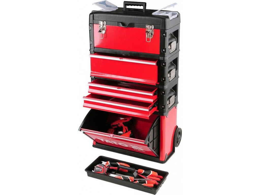 Modulární skříň/box na nářadí - 3-dílná. Souprava se skládá z hlavního modulu, kde najdeme vestavěná kola, teleskopickou hliníkovou rukojeť. Nosnost hlavního modulu je 15kg a rozměry 410x210x280mm. Střední modul má 2 kovové zásuvky s nosností 5kg a rozměry jednotlivé zásuvky je 390x215x60mm. Do těchto zásuvek lze vložit vložy s nářadím Yato. Zásuvky jsou na kovových kuličkových ložiskách. Horní modul je klasický s horním víkem o rozměrech 420x220x150mm a nosnosti 20kg. Má vestavěné 2 malé organizéry a uvnitř vložku na nářadí. Moduly rovnou horní plochu, která může sloužit jako pracovní deska. Navíc mají drážku, která je velmi užitečná při vrtání nebo šroubování. Kromě toho, že moduly jsou vybaveny komfortní a protiskluzovou rukojetí a boční rukojetí pro snadné zvedání mají také protiskluzové dolní hrany rohů. Skříň můžete rozšířit o další modul přidáním modulu YT-09107 nebo YT-09108. Moduly mají horní a střední kovové jištění mezi sebou.