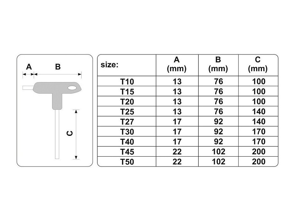 Balení obsahuje klíče T10, T15, T20, T25, T27, T30, T40, T45 a T50.