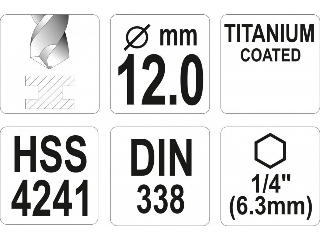 Vrták na kov 12mm TITAN HEX 1/4", délka 151mm - YT-44774