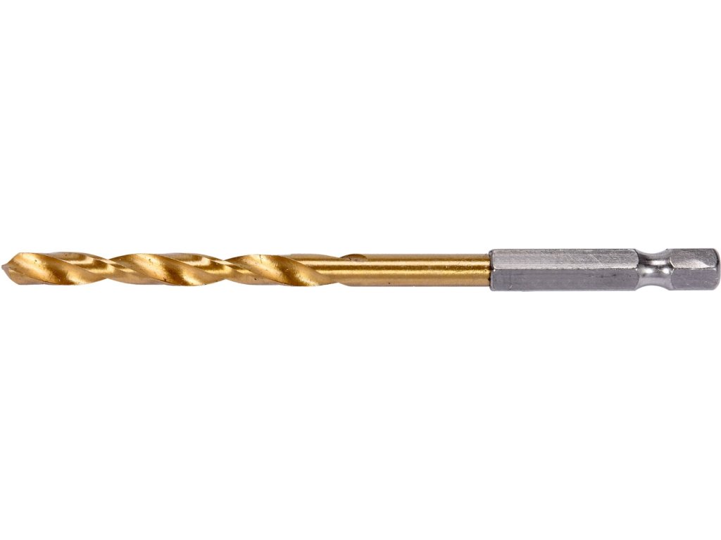 Vyrobeno z rychlořezné HSS oceli s Titanovým povlakem a vrcholovým úhlem 135°. Vrták je opatřen HEX 1/4" uchycením.
